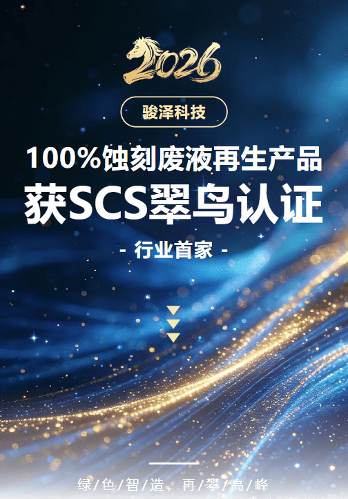 2026年1月28日,深圳骏泽环境科技有限公司传来重磅喜讯——其PCB蚀刻废液资源化再生氧化铜、硫酸铜产品成功通过该认证,成为行业首家实现100%PCB蚀刻废液资源化再生利用认证的企业,用硬核技术改写行业绿色标准!